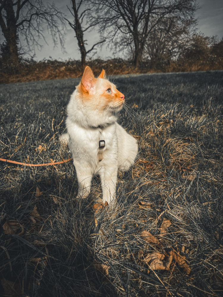 • Gehe mit der Katze an der Leine in ruhigere Außenbereiche wie Parks oder Feldwege.