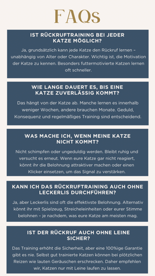 Wichtig: Gib den Rückrufbefehl möglichst nur einmal. Mehrmaliges Rufen kann dazu führen, dass die Katze erst nach dem dritten oder vierten Ruf reagiert.