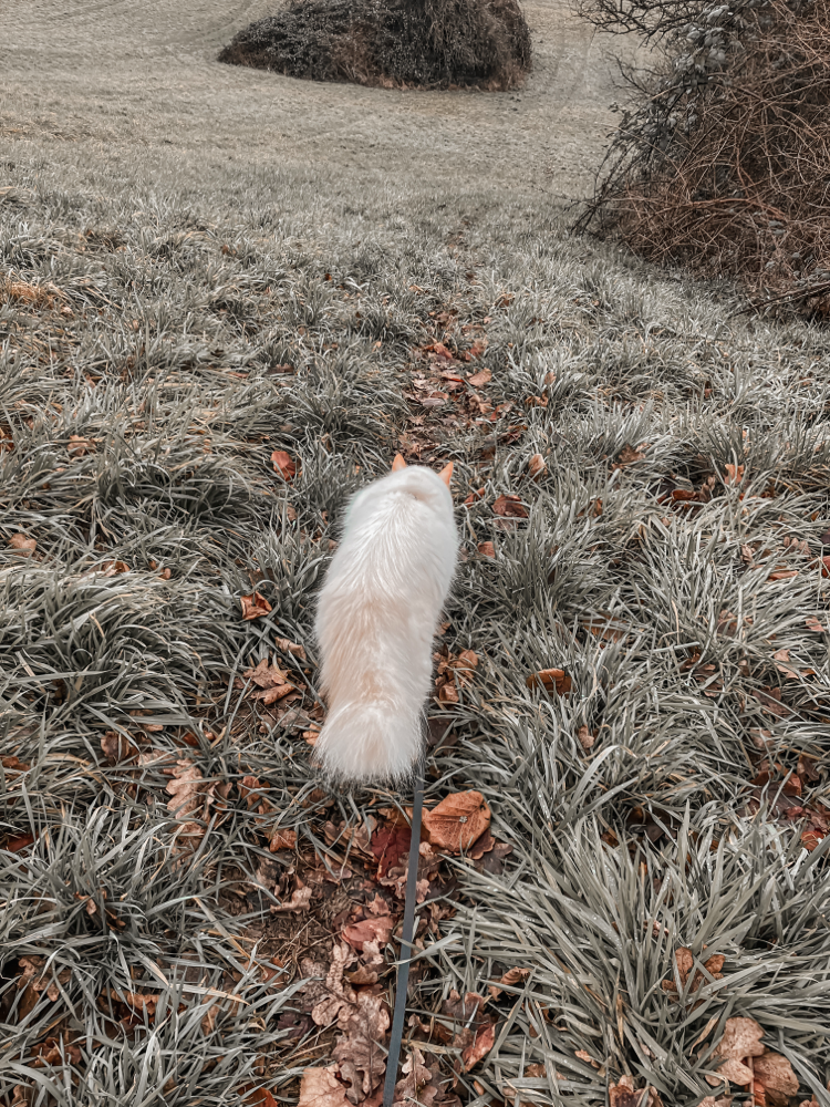 - Je nach Situation: Manchmal ist in der Nähe ein Busch, ein Baum oder eine kleine Struktur, hinter der sie sich ducken können, ohne dass die Leine Zug aufbaut. Dann nutze ich das, um zum Beispiel eine kleine Sichtbarriere zu schaffen.