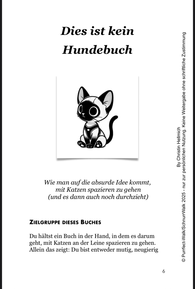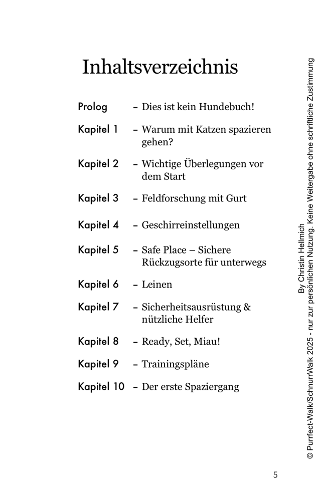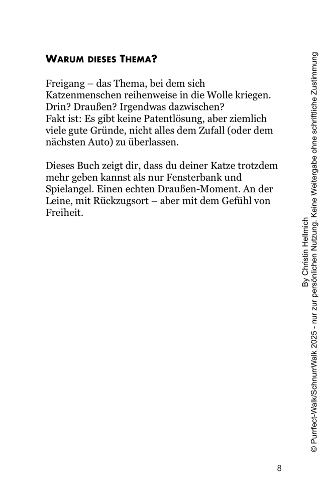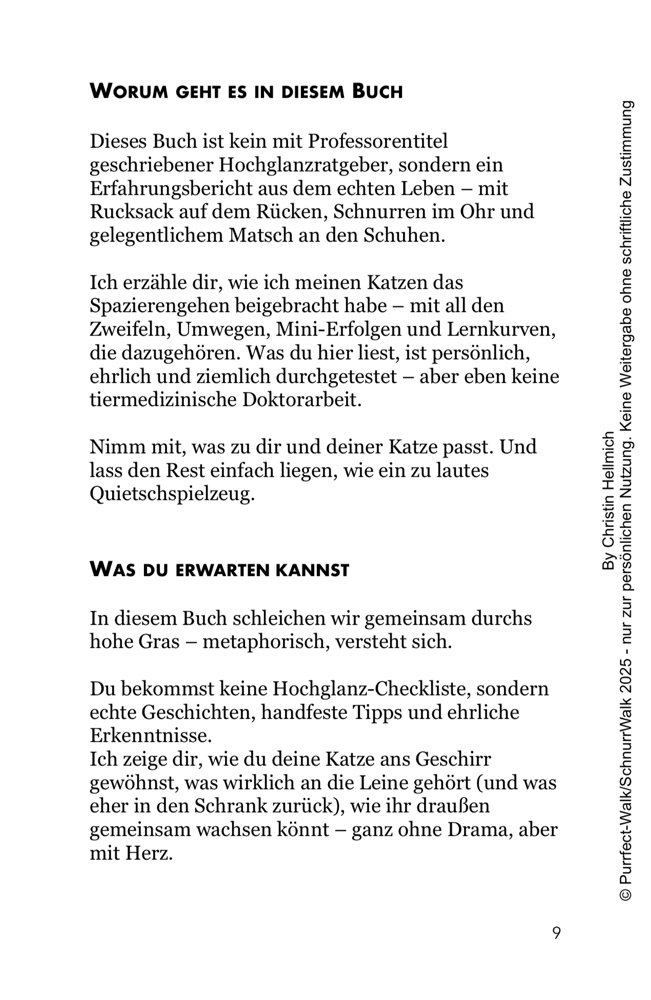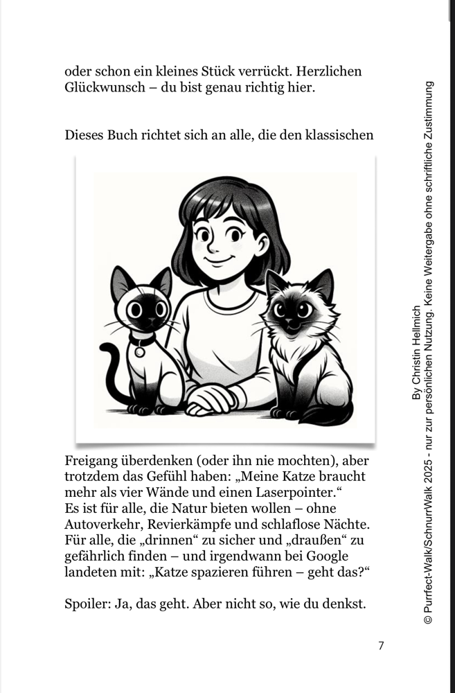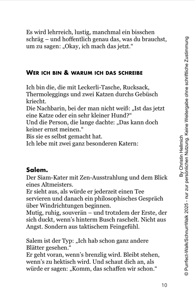 Der Purrfect Walk Guide ist mein persönliches Herzensprojekt. Entstanden aus Jahren voller Umwege, Erkenntnisse, Spaziergänge im Regen, Erfolgsstories und totaler Katastrophen. Ein Buch, das nicht nur erklärt, wie Katzenspaziergänge funktionieren – sondern auch warum sie sich lohnen. Für dich. Für deine Katze. Für eure gemeinsame Verbindung.